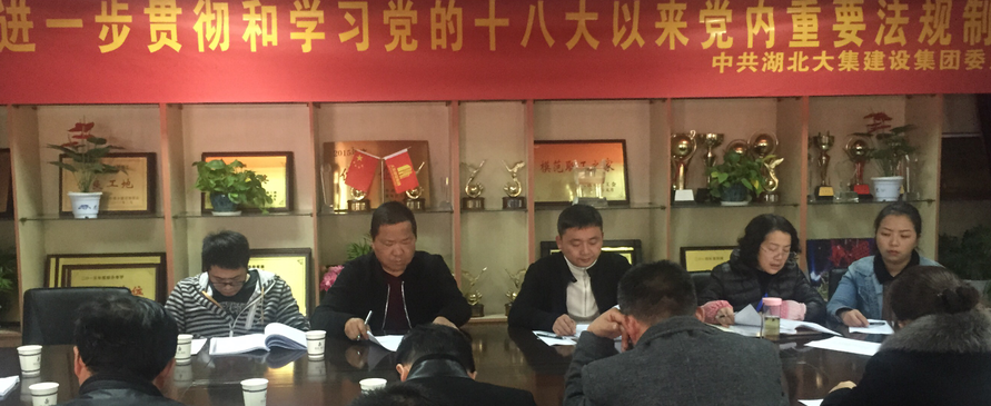 為了深入貫徹落實(shí)黨的十八屆六中全會精神,增加思想政治教育,加強(qiáng)黨的知識普及,2016年11月21日下午,湖北大集建設(shè)集團(tuán)黨委組織全體黨員同志在集團(tuán)會議室集中學(xué)習(xí)《中國共產(chǎn)黨章程》、《中國共產(chǎn)黨廉潔自律準(zhǔn)則》、《關(guān)于新形勢下黨內(nèi)政治生活的若干準(zhǔn)則》、《中國共產(chǎn)黨紀(jì)律處分條例》等黨內(nèi)文件和重要法規(guī)制度。