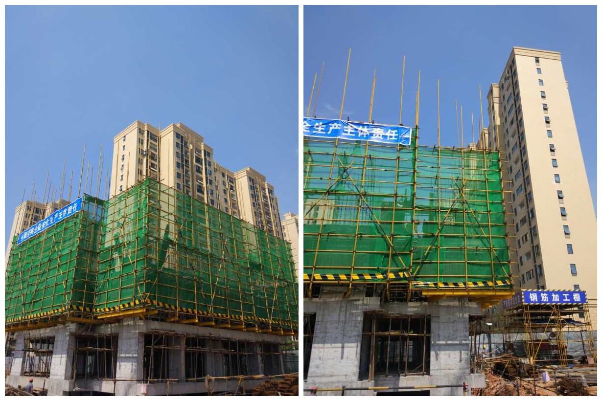 (6月7日,工程管理部檢查結(jié)果:外架采用最新規(guī)范要求,每步架子設置兩道攔腰桿,間距600,防護功能更好。)