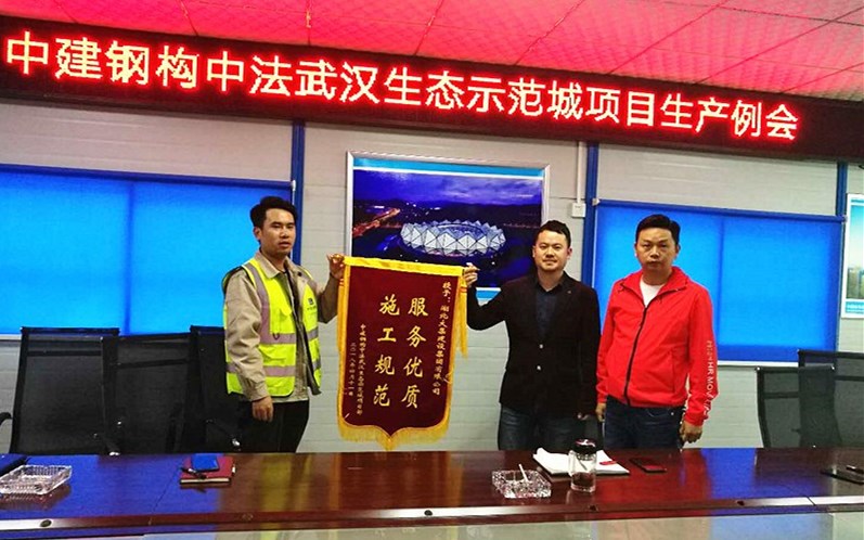 2018年4月13日,由集團(tuán)公司參與承建的中法新城規(guī)劃館項(xiàng)目獲得中建鋼構(gòu)嘉獎,授予“施工規(guī)范,服務(wù)優(yōu)質(zhì)”的錦旗,項(xiàng)目經(jīng)理徐斌和工程部副部長陳超共同接受了這一榮譽(yù)。