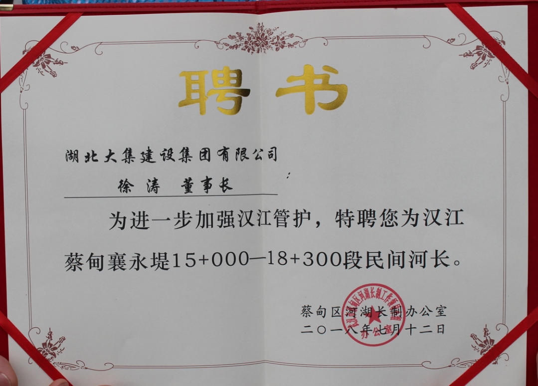 水是生命之源、生產(chǎn)之要、生態(tài)之基。為貫徹落實(shí)習(xí)近平總書記視察湖北的重要講話精神,進(jìn)一步加強(qiáng)河湖管理和保護(hù)工作,7月12日,蔡甸區(qū)漢江民間(企業(yè))河長(zhǎng)履職啟動(dòng)儀式于蔡甸區(qū)江灘公園隆重舉行,湖北大集建設(shè)集團(tuán)董事長(zhǎng)徐濤受聘為漢江蔡甸襄永堤15+000—18+300段民間河長(zhǎng)。