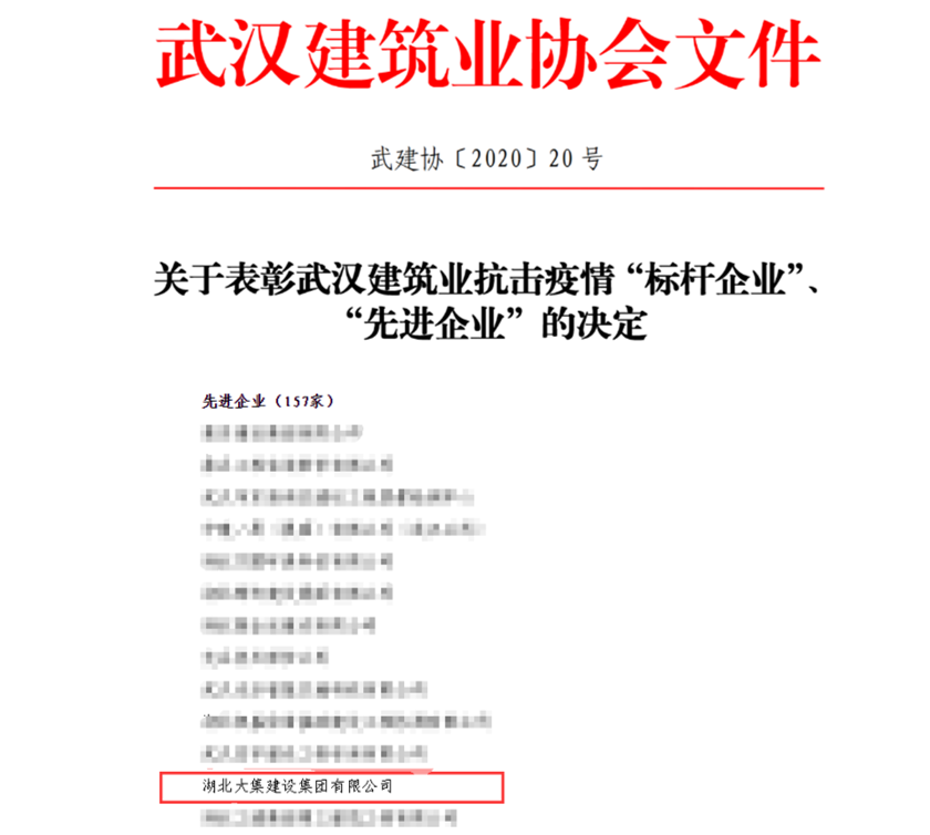 4月14日,武漢建筑業(yè)協(xié)會(huì)發(fā)布《武建協(xié)〔2020〕20 號(hào)——關(guān)于表彰武漢建筑業(yè)抗擊疫情“標(biāo)桿企業(yè)”、“先進(jìn)企業(yè)”的決定》,對(duì)在抗疫“主戰(zhàn)場”積極擔(dān)責(zé),奮不顧身、盡銳出戰(zhàn),與死神賽跑、與疫魔競速的27家武漢建筑業(yè)“標(biāo)桿企業(yè)”、157家“先進(jìn)企業(yè)”進(jìn)行表彰。湖北大集建設(shè)集團(tuán)因在抗疫過程中主動(dòng)作為、勇于擔(dān)當(dāng),獲評(píng)“先進(jìn)企業(yè)”榮譽(yù)稱號(hào)。