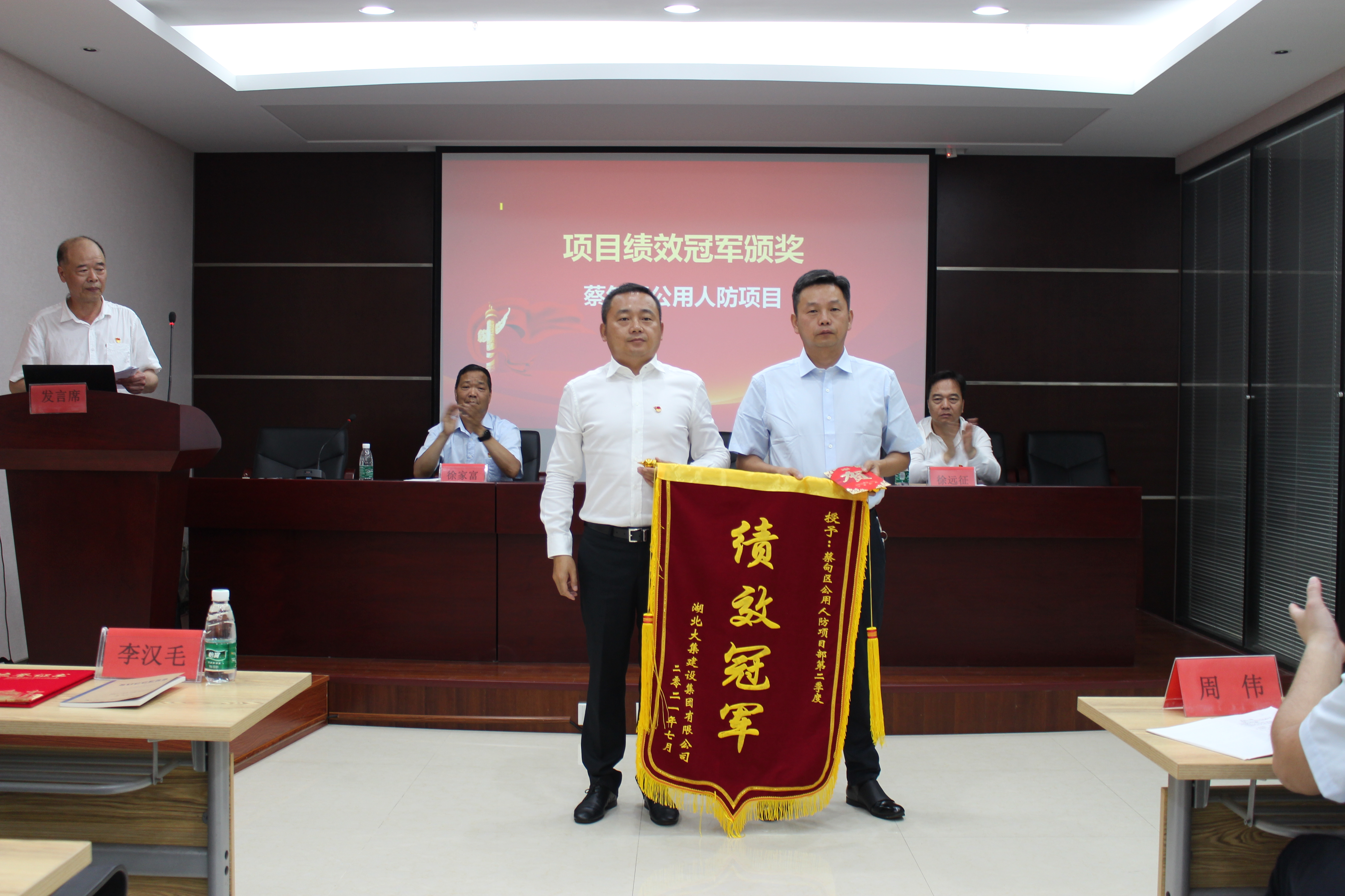 集團(tuán)董事長徐濤為此次績效考評中的冠軍項目——蔡甸區(qū)公用人防項目部頒發(fā)錦旗和獎金。