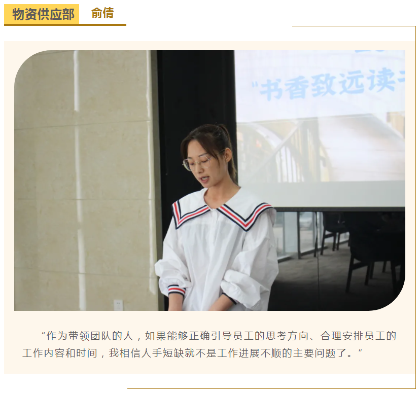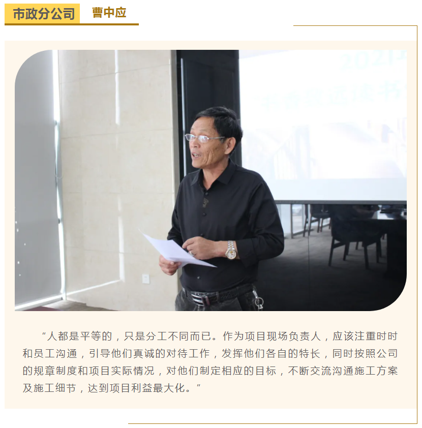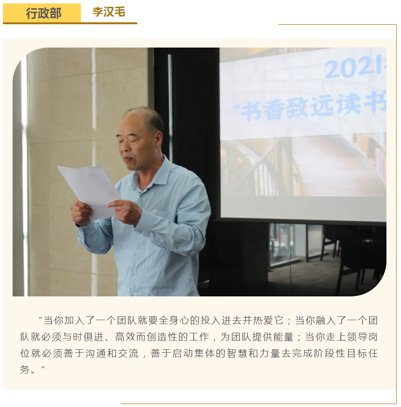 此次中高層領導共讀并分享的書籍是《麥肯錫團隊管理法》,集團公司七位部門負責人依次上臺,結(jié)合各自的實際工作、管理經(jīng)驗等,對書中的觀點進行闡述與分析。在思想交流碰撞中,各位部門負責人進一步加深了對團隊管理的認識,反思了自己在部門管理中存在的問題,了解了更多的管理細節(jié),學習了更有效的管理方法,為今后更好地完成日常管理工作打下了堅實的基礎。